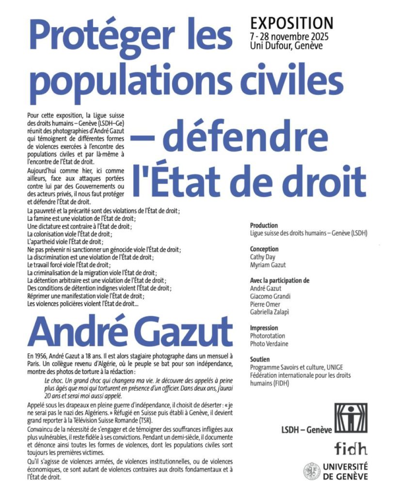 Dans le cadre de la Semaine des droits humains de l’Université de Genève (7–28 novembre 2025), la Ligue suisse des droits humains – section Genève (LSDH–Ge) a le plaisir de présenter une exposition de photographies d’André Gazut.