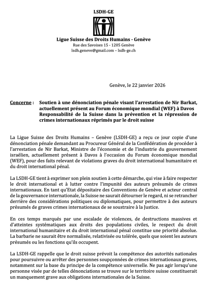 Extrait : « Dans un communiqué de presse, la Ligue suisse des droits humains – Genève (LSDH-GE) a exprimé ce jeudi son soutien à une dénonciation pénale demandant au procureur général de la Confédération de procéder à l’arrestation de Nir Barkat, ministre de l’économie et de l’industrie du gouvernement israélien, actuellement présent à Davos à l’occasion du WEF, pour des faits relevant de violations graves du droit international humanitaire et du droit international pénal.