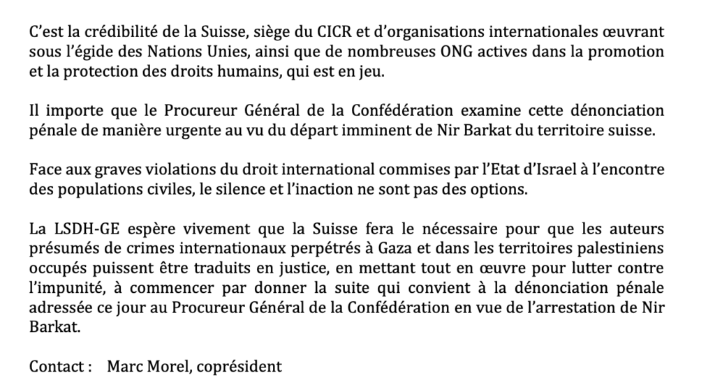 Extrait : « La Ligue suisse des droits humains-Genève (LSDH-GE) a annoncé, dans un communiqué, soutenir la démarche et y voit un test de crédibilité pour la Suisse. Son coprésident Marc Morel rappelle que la Suisse, en tant qu’Etat dépositaire des Conventions de Genève, a l’obligation de poursuivre les crimes internationaux graves. «Cette dénonciation permet de donner une portée concrète à cette obligation», souligne-t-il. Il poursuit: «Ces démarches sont nécessaires. Elles obligent la Suisse à assumer ses responsabilités et à mettre en œuvre la lutte contre l’impunité face aux crimes commis par Israël.» La présence temporaire de Nir Barkat en Suisse donne à cette exigence, selon la LSDH-GE, une portée immédiate »